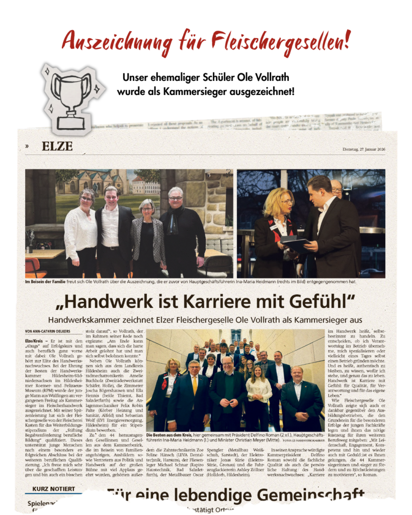 - Auszeichnung für FleischergesellenUnser ehemaliger Schüler und Fleischergeselle Ole Vollrath wurde als Kammersieger der HWK Hildesheim-Südniedersachsen ausgezeichnet und hat sich damit für ein… Auszeichnung für Fleischergesellen weiterlesen