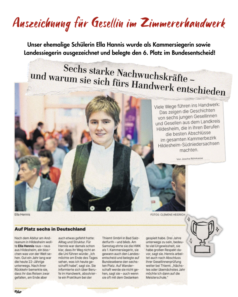- Auszeichnung für Gesellin im ZimmererhandwerkAuch unsere ehemalige Schülerin Ella Hennis wurde von der Handwerkskammer ausgezeichnet. Neben Kammersiegerin ist sie außerdem Landessiegerin und belegte im… Auszeichnung für Gesellin im Zimmererhandwerk weiterlesen