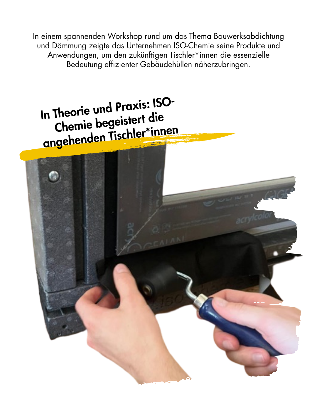In einem spannenden Vortrag rund um das Thema Bauwerksabdichtung und Dämmung zeigte das Unternehmen ISO-Chemie seine Produkte und Anwendungen. Um den zukünftigen Tischler*innen die essenzielle Bedeutung effizienter Gebäudehüllen näherzubringen.