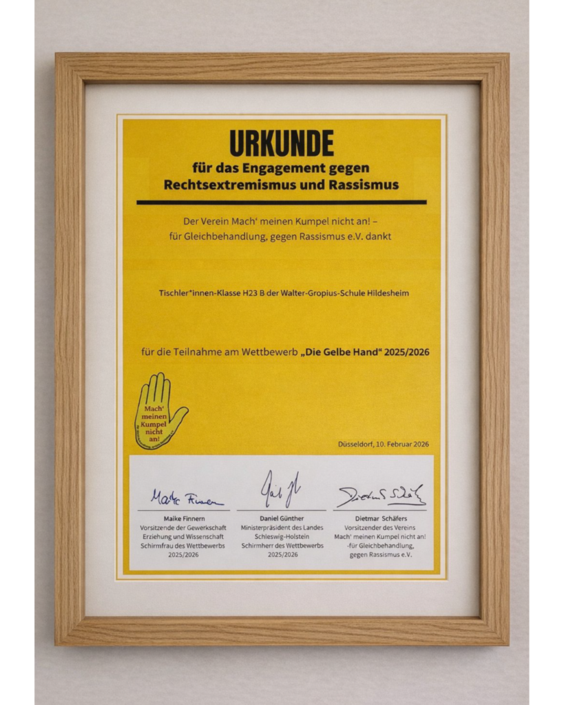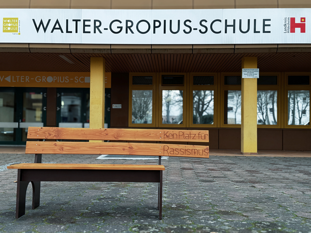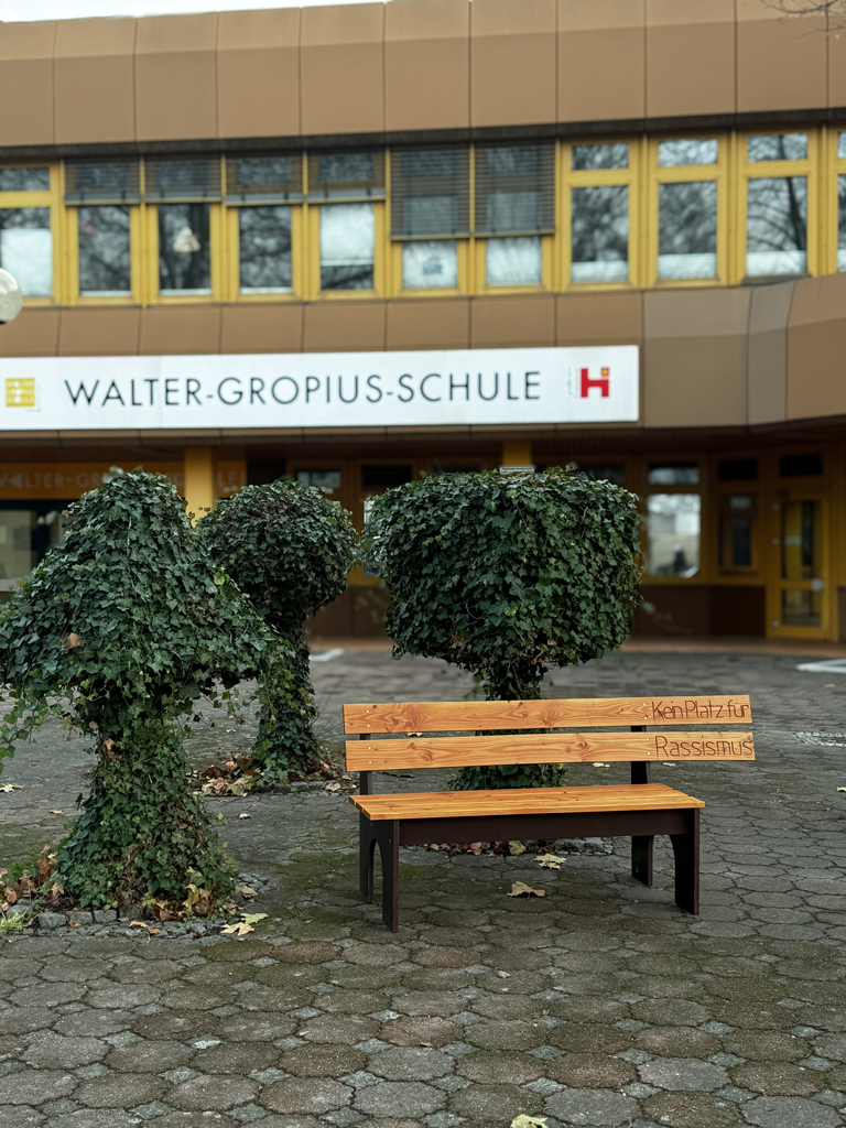 Im Rahmen eines schulischen Projekts entstand an der Walter-Gropius-Schule eine Sitzbank, die handwerkliche Ausbildung mit einer klaren gesellschaftlichen Aussage verbindet. Anlass für die Umsetzung war die Teilnahme am Wettbewerb „Die Gelbe Hand“, der Auszubildende und Berufsschüler*innen dazu aufruft, kreative Zeichen gegen Rassismus und Rechtsextremismus sowie für ein solidarisches Miteinander zu setzen.