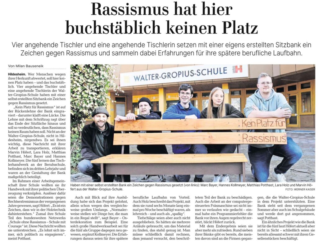 Als Teil des Netzwerks Schule ohne Rassismus – Schule mit Courage verbindet die Walter-Gropius-Schule mit diesem Projekt handwerkliche Ausbildung und gesellschaftliche Verantwortung. Die Bank steht im Schulalltag für Vielfalt, gegenseitige Achtung und ein deutliches „Nein“ zu Diskriminierung – und zeigt, wie handwerkliche Projekte auch über die Werkstatt hinaus Wirkung entfalten können.
