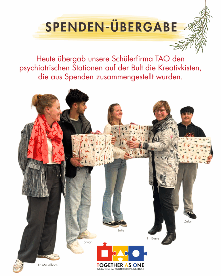 Heute übergab unsere Schülerfirma TAO den psychiatrischen Stationen auf der Bult die Kreativkisten, die aus Spenden zusammengestellt wurden. Damit fand ein tolles Projekt unserer Schülerfirma seinen Abschluss.Danke an Lotte, Shvan und Zafar aus der BFSdual T, die sich gemeinsam mit…